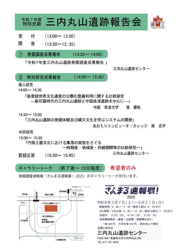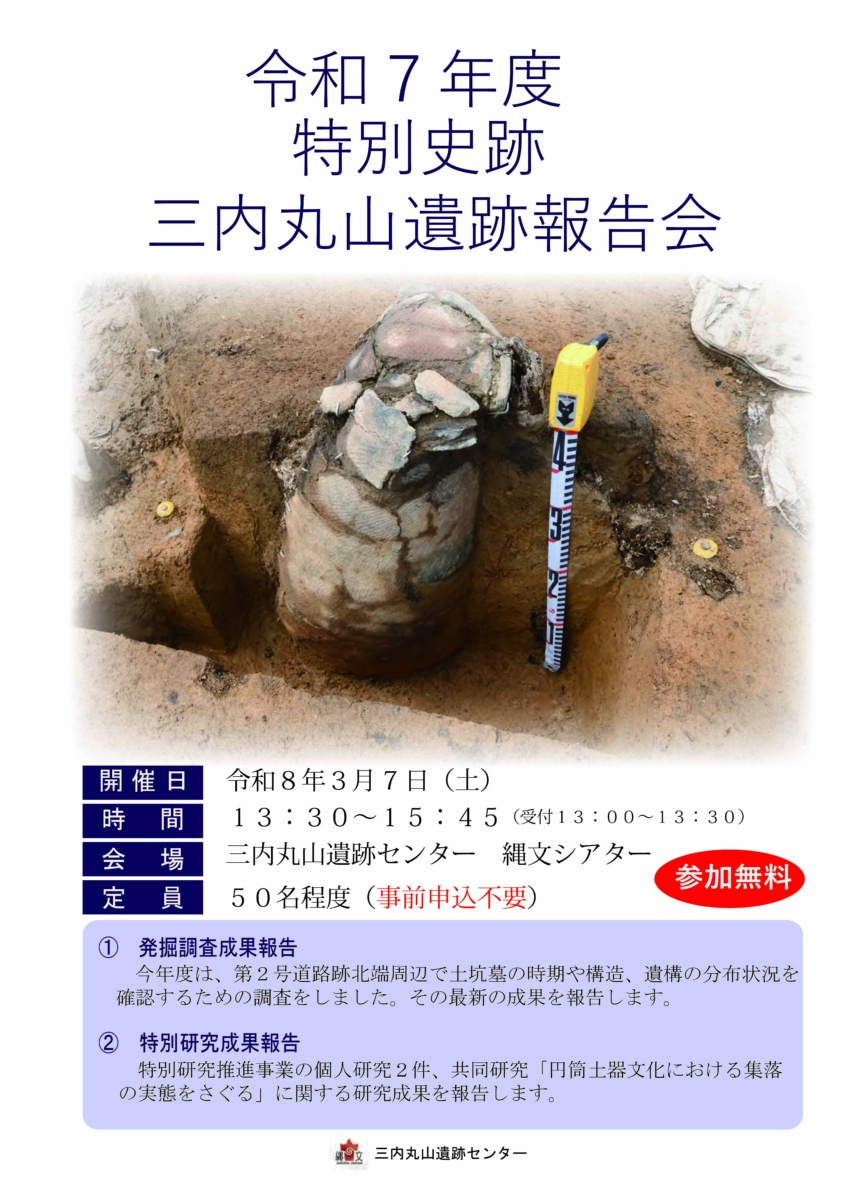 三内丸山遺跡センターでは、発掘調査や特別研究の成果を広く公開するため、遺跡報告会を毎年実施しています。 令和7年度は、今年度実施した発掘調査成果に加え、特別研究推進事業個人研究2件と共同研究の報告を行います。